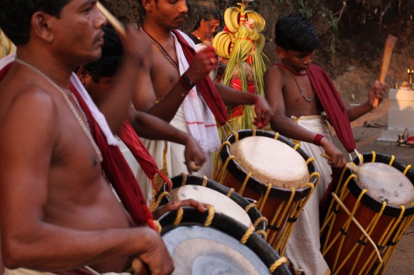 After dawn broke the crowd largely dispersed to wash, change and eat, but they had begun to trickle back when Kuttichathan reappeared, and were fully in attendance for the next theyyam, Pottan Daivam, who is conceptually one of theyyam’s most important and popular deities. A large bonfire had earlier been lit just beside the low wall of the temple and this was now beginning to burn down, although it still emitted a ferocious heat, adding to the heat of the morning. I watched as a heavily built, quite angry looking young man was meticulously prepared for his transformation. Each part of his costume was reverentially applied and he held a small talisman to his chest before wrapping it into the wide strip of material bound around his middle. Over this he put on red britches and a long coconut skirt and when all was finished he looked quite similar to Guligan, except his face was painted bright orange, with black circles around his eyes. Soon after beginning his rituals he put on a large white mask and then proceeded to fling is arms about, ignoring Guligan, who was close by. He picked up a rusty dagger in one of his red-painted hands and a staff in the other and danced around in front of a theyyam shrine while the drummers, who had started up again for Kuttichathan, pounded at their instruments with unceasing energy. It is almost always men from the Malayan caste who drum at the festivals and they are experts in their art. They push one another to drum ever louder and faster, without ever losing the complicated rhythm, continuing for hours, past every point beyond which one would think it physically impossible to continue, revelling in their extraordinary abilities.