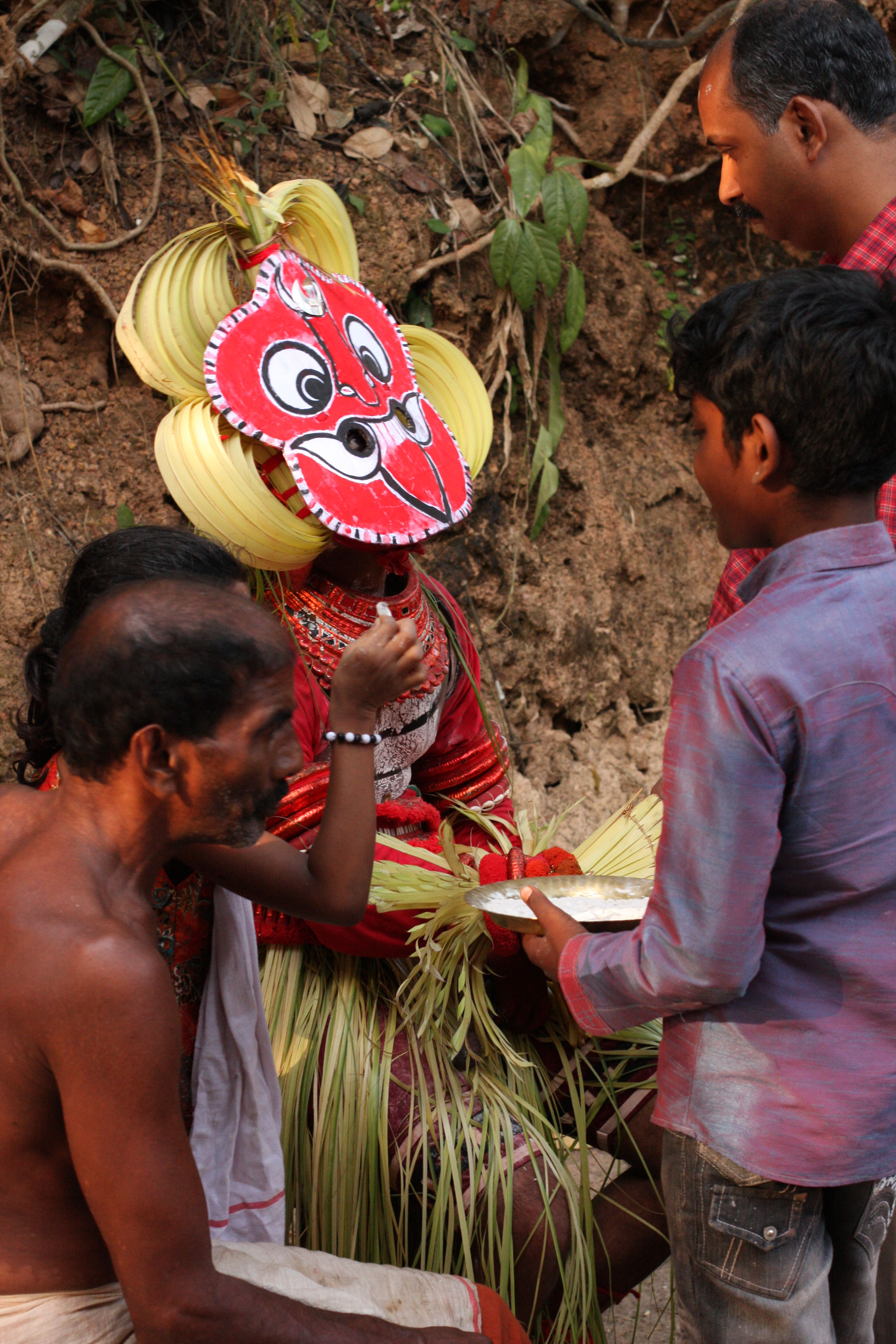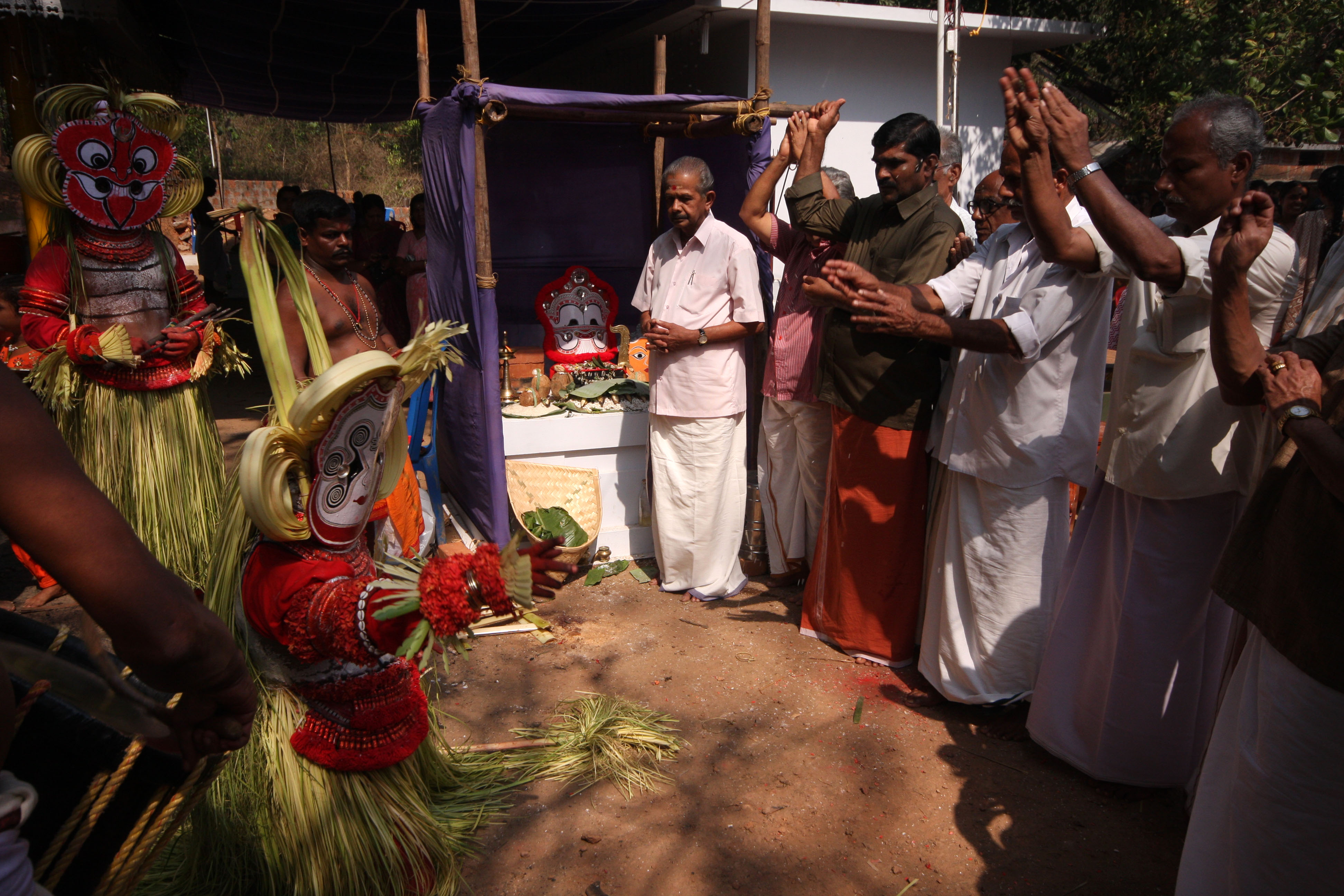 Earlier, I’d asked Mr Jawardhanan whether he believed the performer was really possessed by a god and he’d laughed amiably and said ‘maybe for a moment, but the rest of the time it’s just acting.’ Yet now he stood with his head bowed and his hands clasped in prayer, as serious and awe-struck as the rest of the crowd.