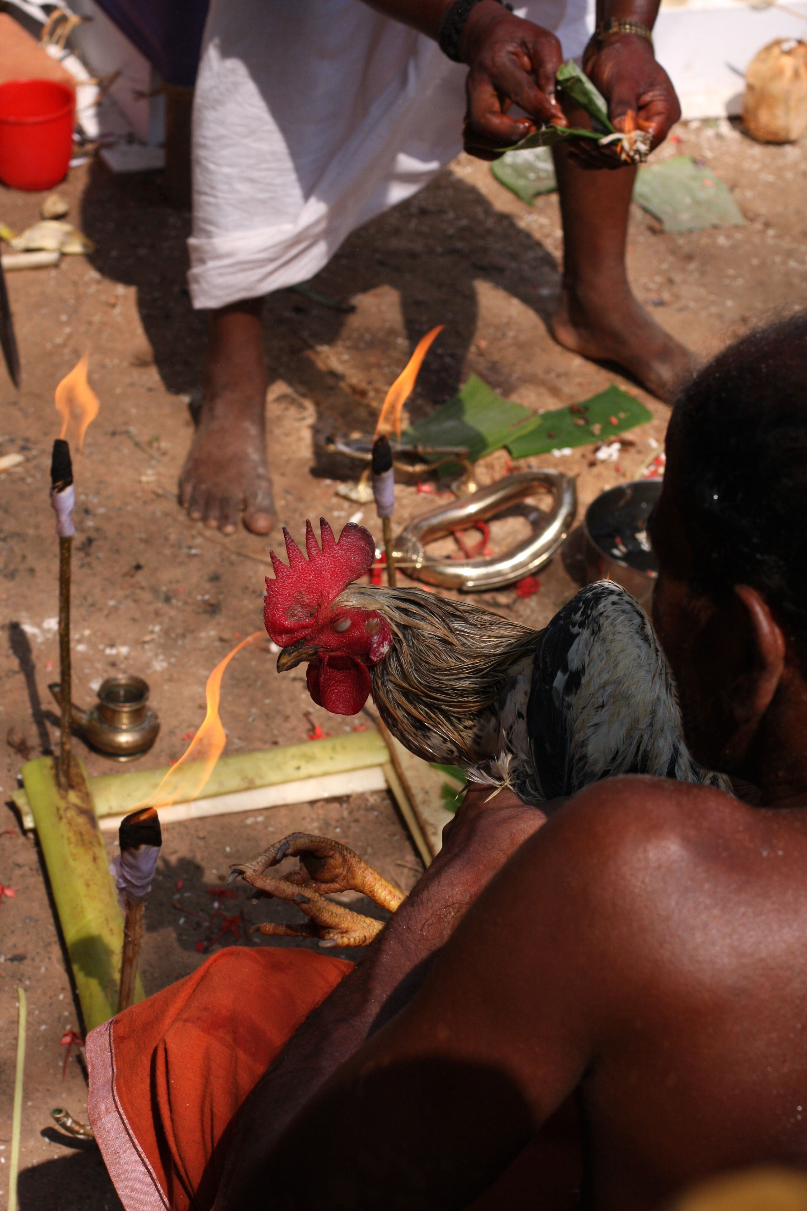 Suddenly an old man wrapped only in an orange loin cloth, came forward holding a chicken. All the children, particularly the boys, pressed in for a better look as the chicken was laid on the ground within a square made from reeds, with small torches burning at each corner. Pottan Daivam, who was already sitting cross-legged in front of this simple altar, was handed a cleaver and he swiftly beheaded the bird, holding the flapping creature still as it waved its severed neck frantically back and forth. Some of the gushing blood was collected into a small metal bowl already containing a gelatinous red substance, then the god upended this bowl onto the ground and rubbed the blood into his hands.