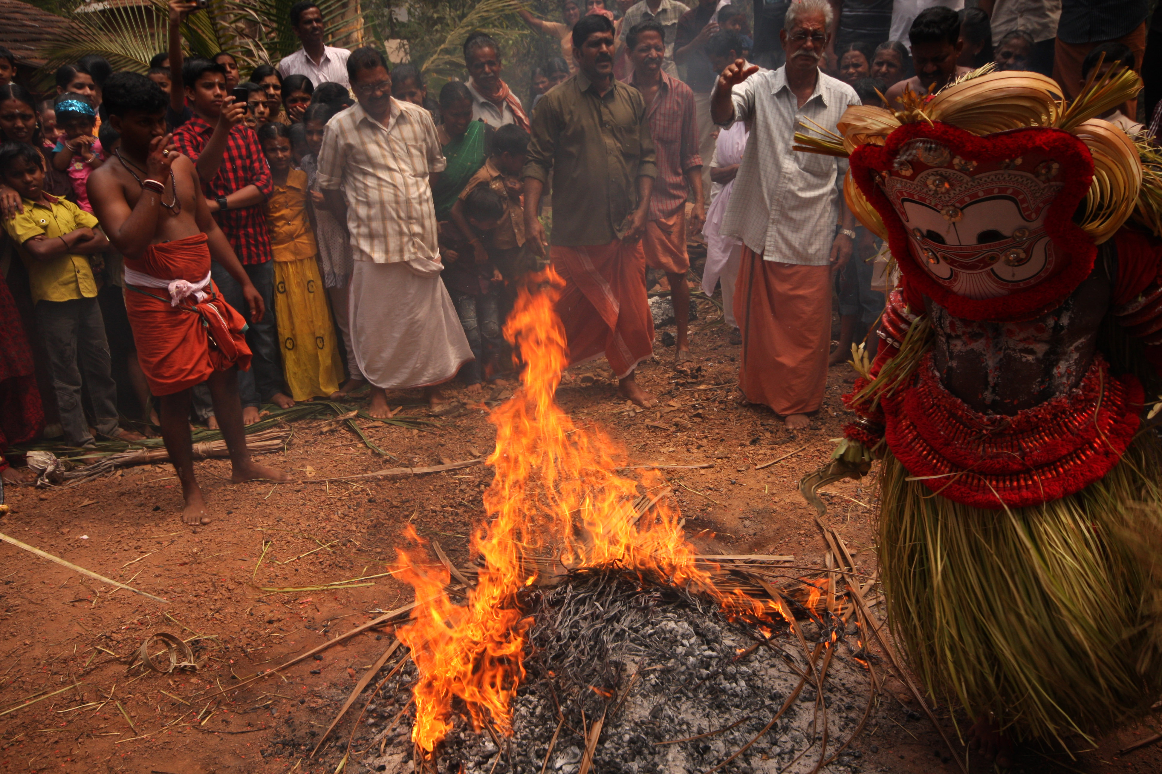 Mr Jawardhanan, who had joined me again, told me the god was complaining of the cold! The crowd watched silently, frowning with concern as the attendants threw down bunches of dry reeds, which immediately burst into flames, and still the god continued to run around and lie down.