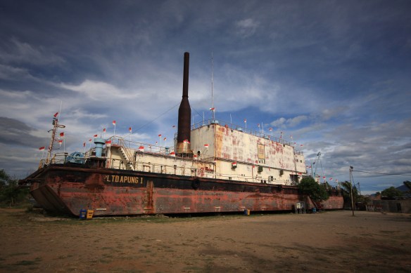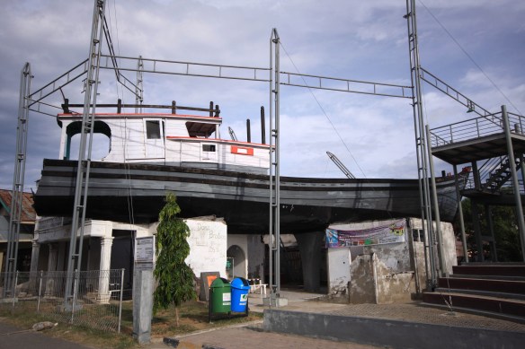 The boat in the suburbs blew me away – I hadn’t expected to see anything like it. An enormous metal ship – some kind of power-generator vessel – sits incongruously surrounded by houses, four kilometres from the sea. We arrived just before prayer time (the third or fourth that day) and Uni went off to a nearby mosque while I circled the massive, lumbering hulk, trying to get a decent photo of it, and munching surreptitiously (I had learnt my lesson) on chocolate biscuits. When she returned, so did the man in charge of the boat, and he took down a rope barrier from in front of some stairs up the side of the hull. We walked up to the top deck and from there had a good view of Banda Aceh. It looked like a quiet, relaxing place, more like a large provincial town than a city. There was abundant greenery between the buildings and no high-rises. The line of blue sea was clearly visible in the near distance.