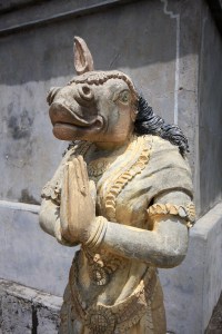 A smaller temple right next to the spring had, outside it, two of the strangest looking deities I’ve ever seen. One looks like a cross between a goddess, a fish and a one-eared horse, while the other had the head of a rat, except with long, curly black hair. I later discovered that Mahavitapura means ‘city where the horse face vanished,’ and refers to a legend concerning an 8th century Chola princess, named Marutapiravikavalli who had a face like a horse. She was advised by a Shaivite sage to bathe in the sacred spring at Keerimalai, and pray to Skanda. Eventually her condition was cured and she had this temple constructed to show her gratitude. This at least explains one of the weird looking statues near the spring.
