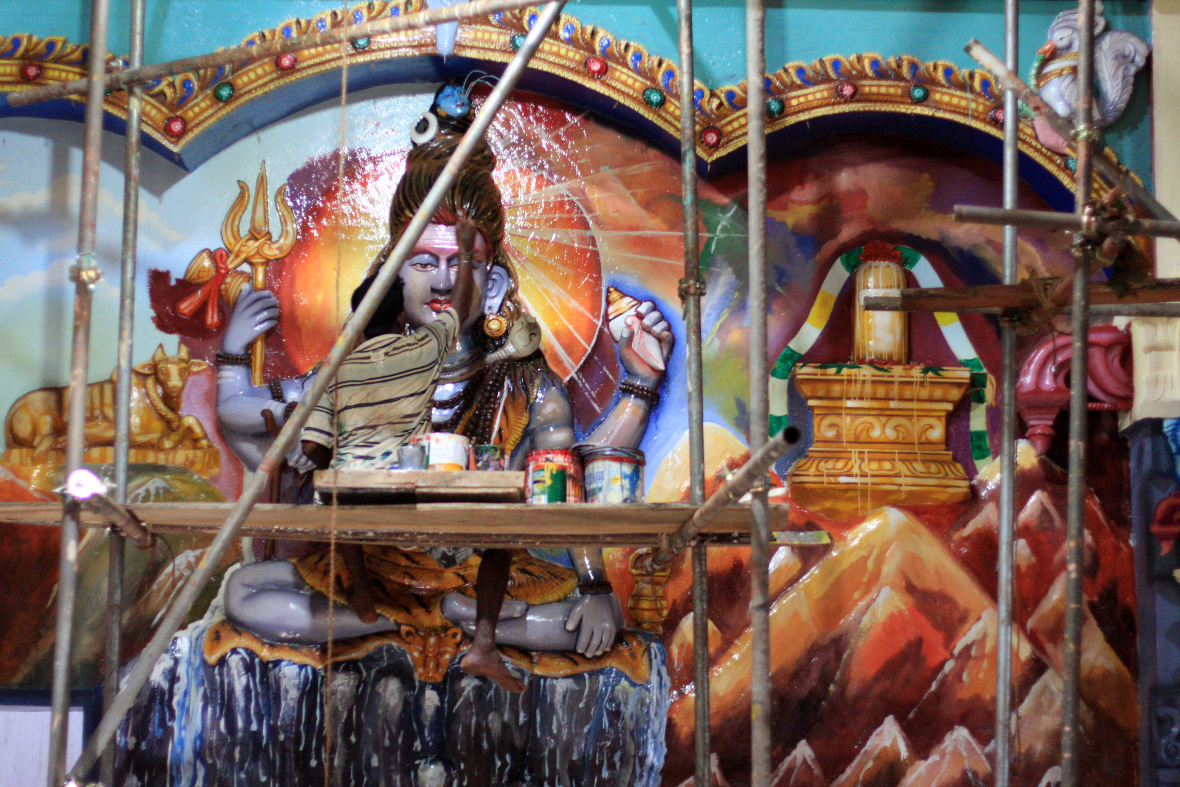 Near the spring is the Hindu Naguleswaram Kovil. It was in the process of being renovated and several men were painting the walls and the newly carved gods and goddesses, in bright, gaudy colours. They painted quickly in an expressionistic, almost slapdash, fashion.