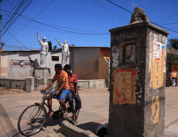 On Beach Road there’s the Martyr’s Monolith, which remembers 31 locals killed by the military in 1986, and also a weird statue of a man wearing dark glasses with one hand held aloft making a V sign. This is MGR (MG Ramachandran), a Tamil actor turned politician who gave the Tigers $4 million between 1984 and 1987. He’s standing next to a statue of someone else but the description on the plinth is in Tamil.