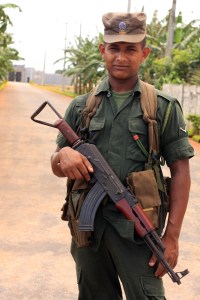 ‘So if I go down there you’ll shoot me?’ I said, sarcastically, which was a stupid thing to say, even if he didn’t understand. I’m not good at being told what to do. He wouldn’t let me even take a photograph of the gate until I had the idea of asking, through mime, if I could take his photo, standing there looking so impressive with his rifle. Sri Lankans love having their picture taken and he quickly agreed! After that there was nothing for it but to turn around and return to town, although at least it was a pleasant cycle ride, past fruit trees, vegetable crops and buffaloes.