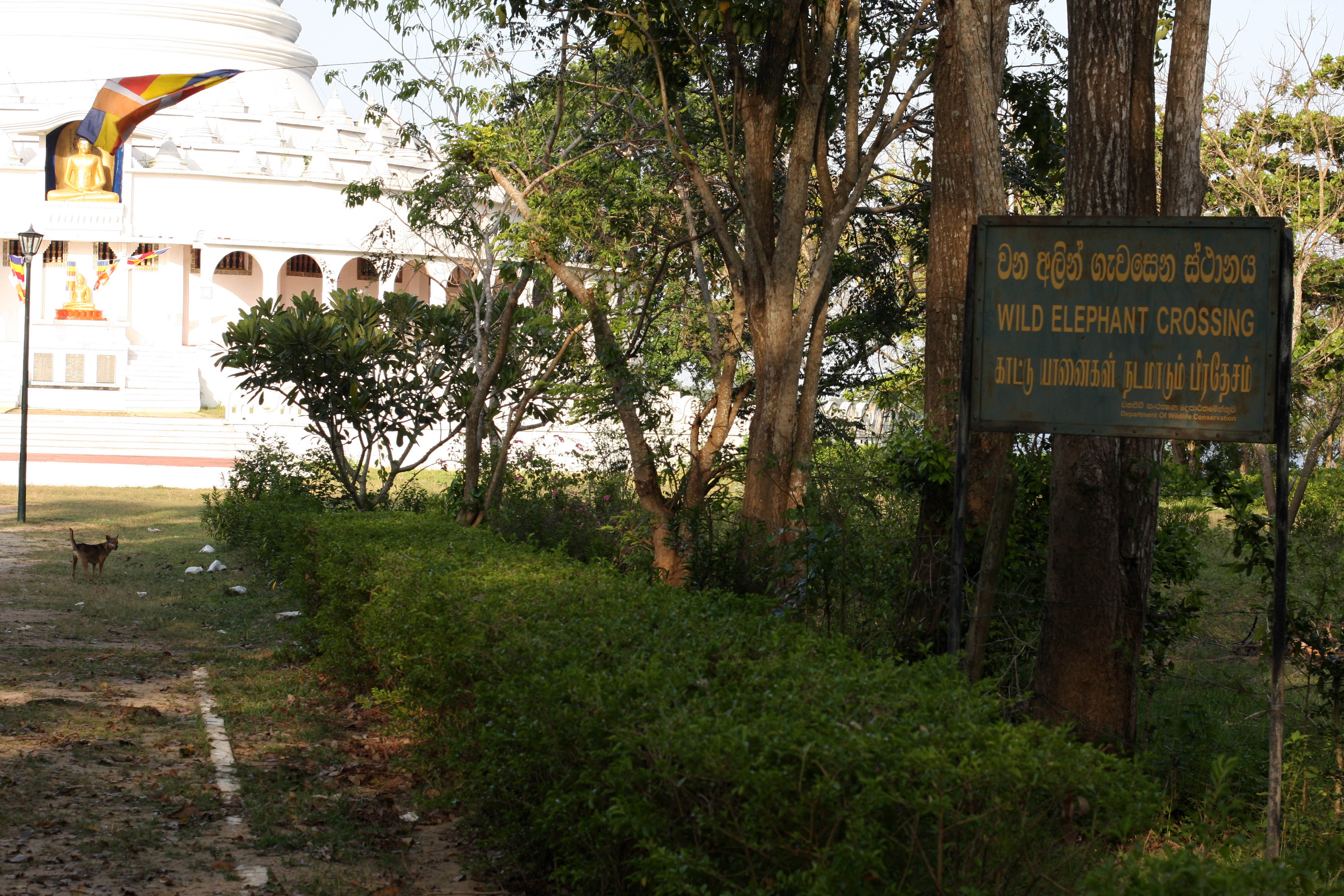 The main reason I wanted to come to Ampara was to see the herds of wild elephants that the Lonely Planet said passed close to a Japanese Peace Pagoda every evening between 5 and 6pm. This pagoda was apparently only 2 km from town. So I set off at about 3pm, when it was marginally cooler, stopping first in a bakery near the clock-tower for an egg roll, an excellent samosa and a milk tea. The samosas are generally different here to India, although you can find the Indian type. They have a kind off breadcrumb coating, are slightly chewy and are stuffed full of vegetables and sometimes boiled egg, as this one was. First I walked to the Sri Manika Pillaiyar, a Buddhist temple en route to the Pagoda, along the road to Inginyagala. It was a pretty route but I was ‘bibbed’, as they say in East London, by practically every moped and lorry, which was a pain. It’s bad enough walking along next to a fairly busy road without the traffic on that road suddenly swooping up close to you and the people in the vehicles yelling out then laughing hysterically!