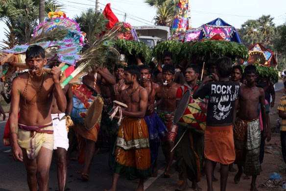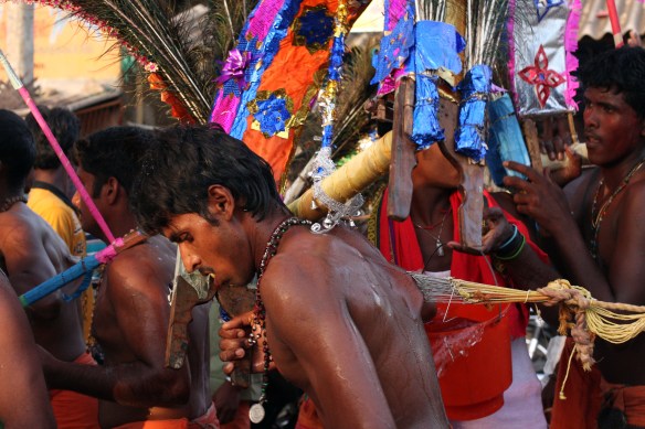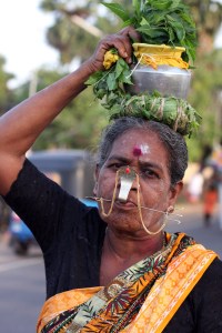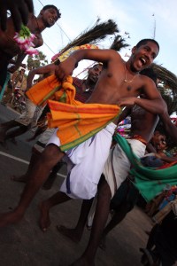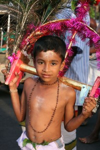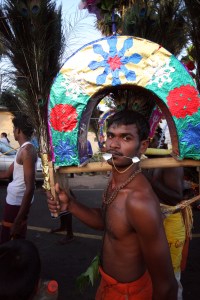 There were dancers and drummers, but most striking were the people whose skin had been pierced with sharp metal hooks. Many men had large numbers of hooks stuck in their backs, attached to long cords that were held by another man behind them. The man in front kept the cord taut by straining ahead, because the more they suffer the more merit they will accrue. This ‘bearing of a burden’ is called kavadi and devotees prepare for it through fasting and puja, and claim to feel little pain. Some men were actually suspended from a vehicle by hooks through the skin of their backs and legs. They kept bouncing up and down and waving their arms as this is meant to stop the skin from tearing.