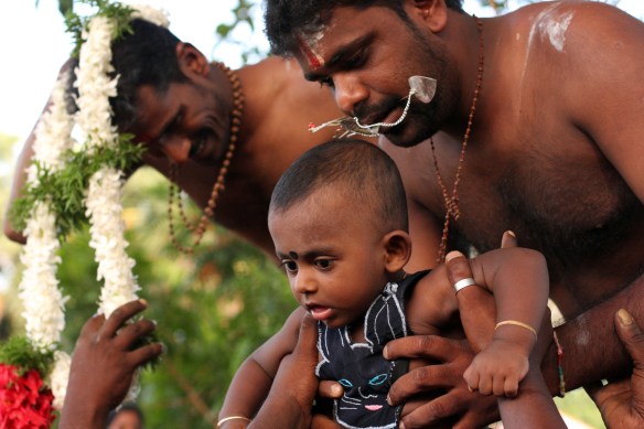 It was a long 4 km to the Kovil and the procession kept stopping so the dancers could go wild. Old women walked along carrying pots of milk, their tongues skewered with tiny Shiva tridents. Children joined in the dancing or sat on the back of the vehicles from which the men were suspended, laughing and waving. Everyone seemed to be having a great time, despite all the self-inflicted pain. It was all a way to worship Murugan, the God of War, and once everyone arrived at the Kovil, pujas went on all through the night.