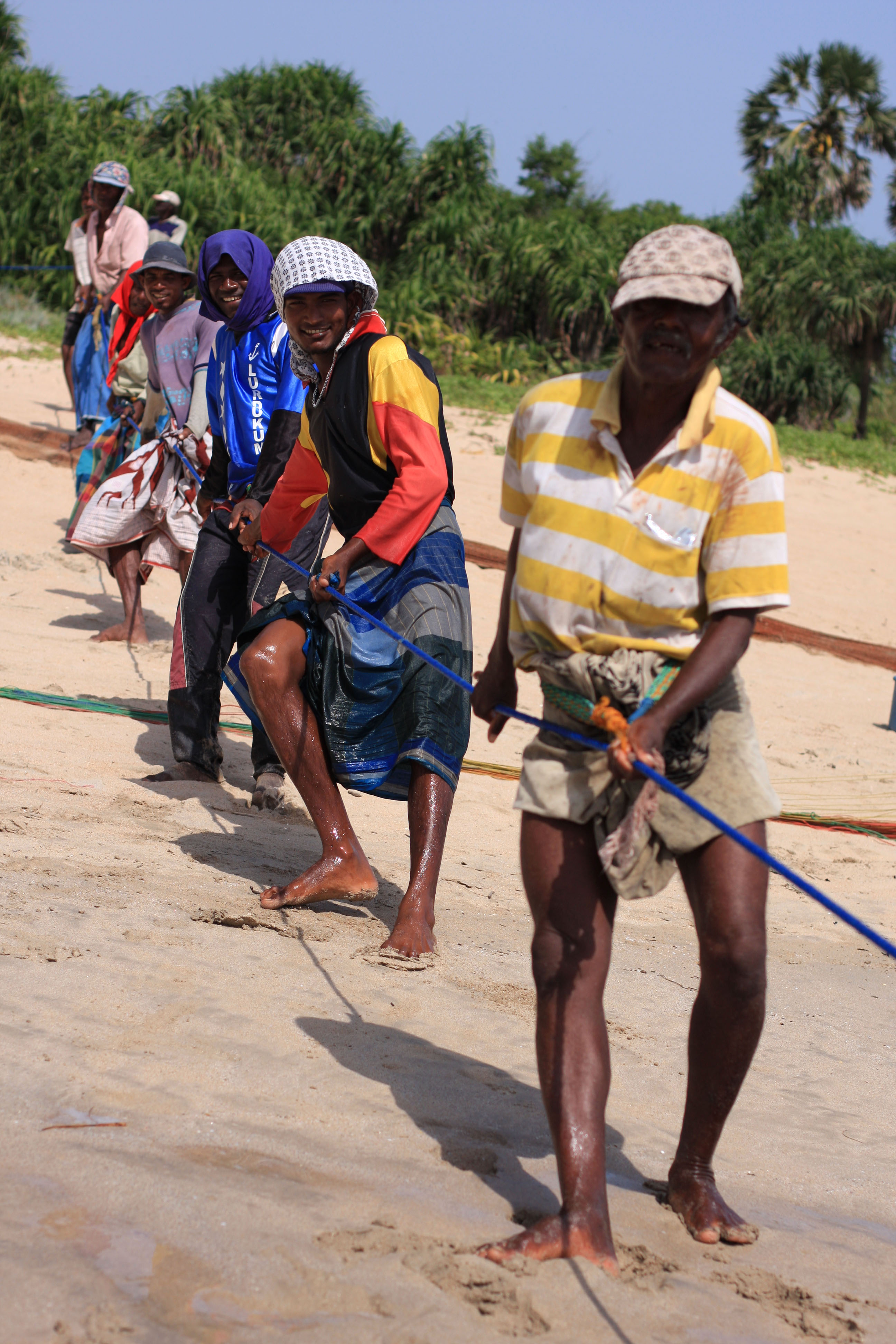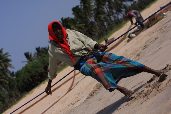 At Irakkandy Beach four groups of fishermen were engaged in pulling in two enormous nets. Another net was already in and was being coiled up, but the other two would take at least another hour to haul in. Two sets of people work on each net, pulling at the two ends, and once the person at the front has walked backwards a few steps the man at the back walks around to take his place. It’s hot, tiring work, as I learnt after only a few minutes of trying it. ‘Then after all this they’re not even sure to get fish,’ Jayantha said. ‘When they don’t it’s very bad: they have no money or food for that day.’