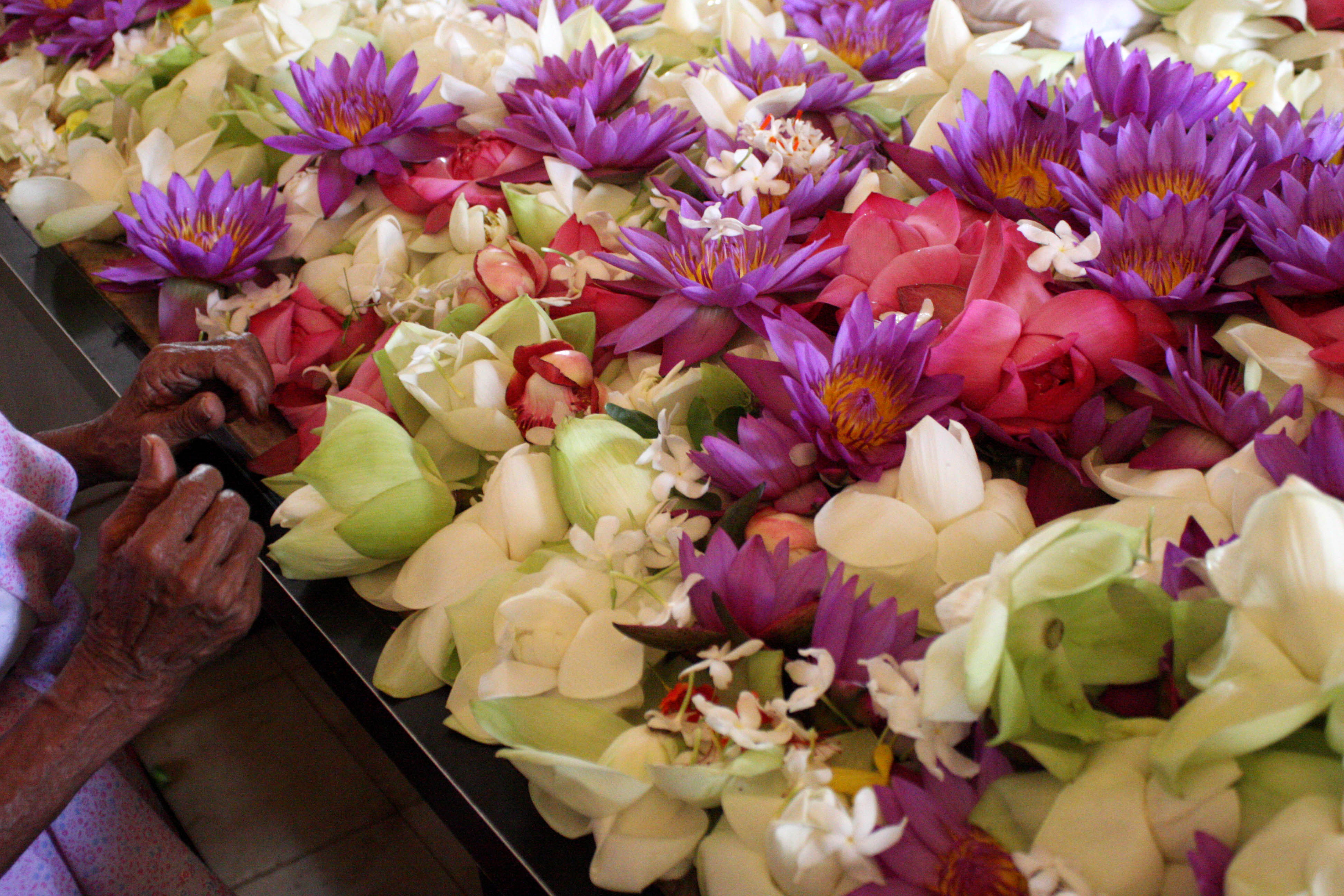 I happened to be in the city around Poson, the important full moon day in June, and the place was packed with devotees, many dressed in white. The city was big enough to accommodate everyone and there was a festive atmosphere, with families picnicking among the ruins, and thousands of flowers offered at altars around the sacred sites. The area around the Sri Maha Bodhi was particularly vibrant.